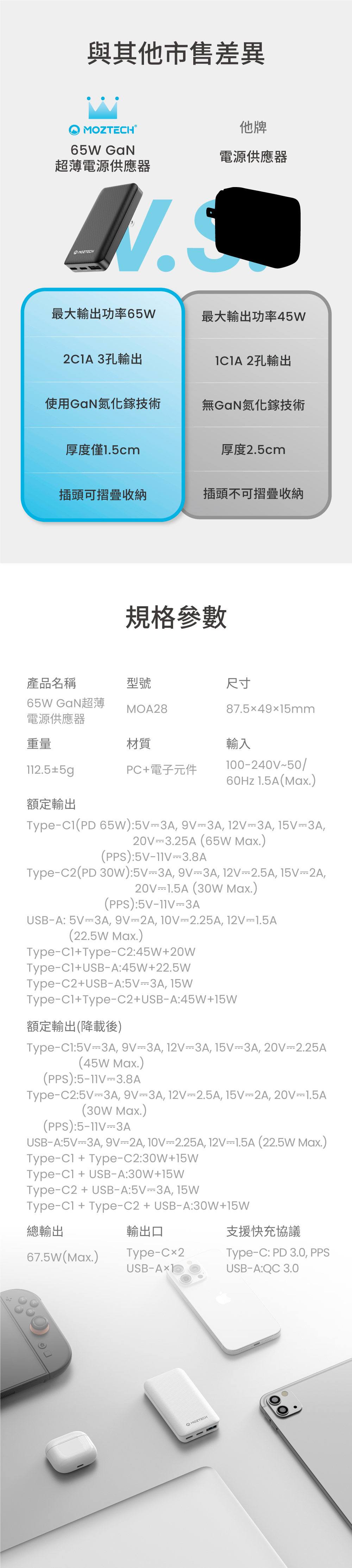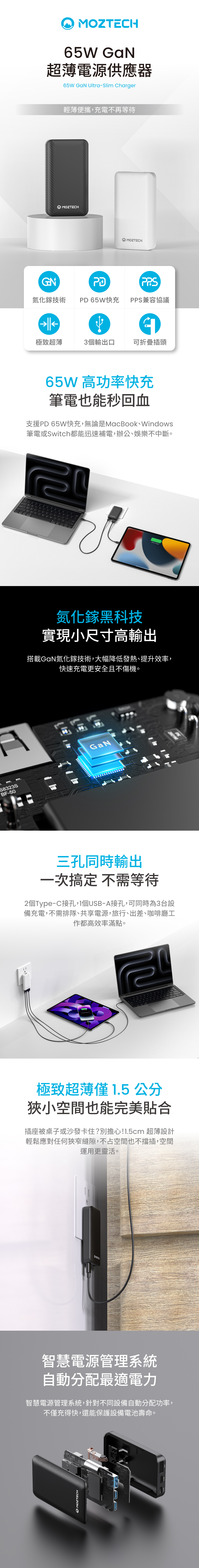 ● 65W GaN 高功率快充 — 筆電、平板、手機皆能快速補電