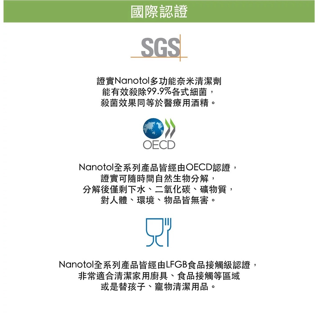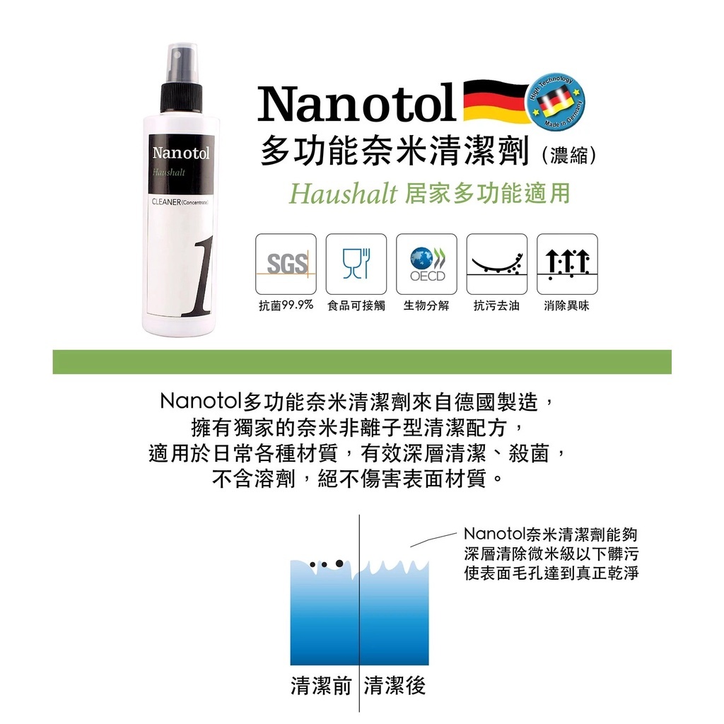 - Nanotol清潔劑易於生物降解,具有活性,甚至可去除最頑固的污垢