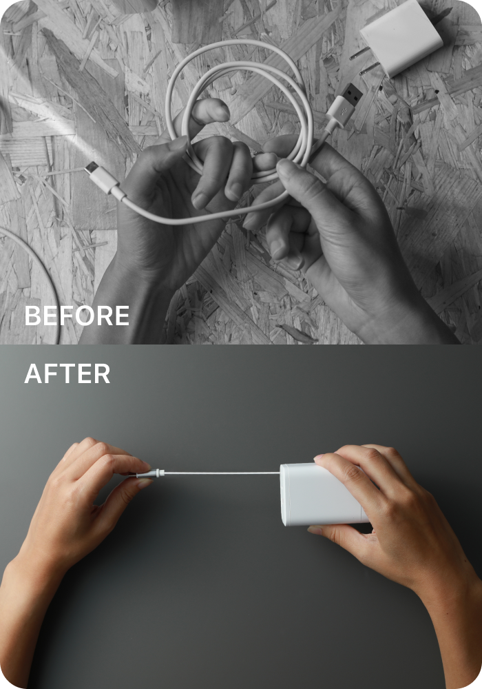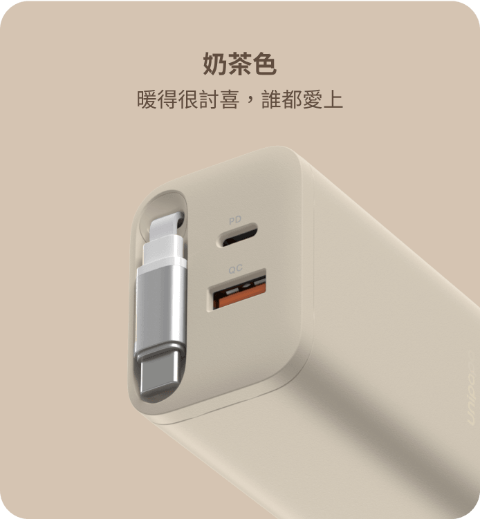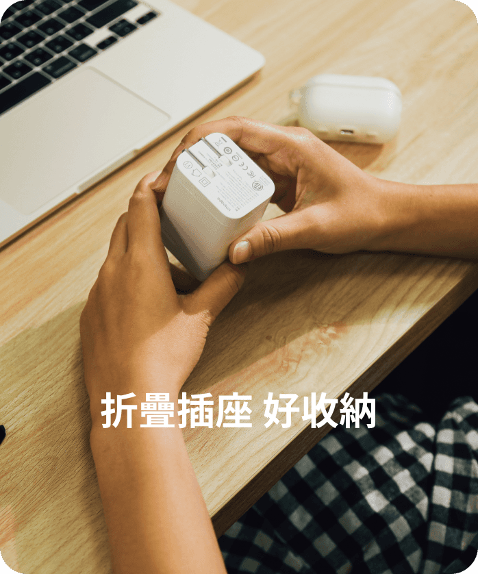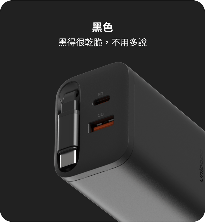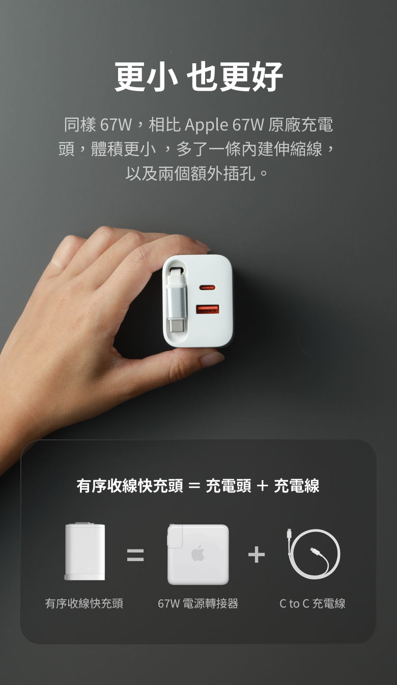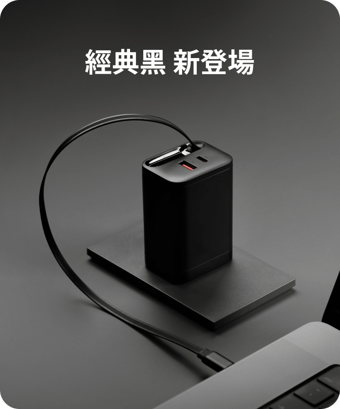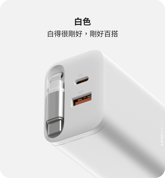● 自帶 USB-C 伸縮線:伸縮線隱藏於快充頭內,拉出即可充電,外出不需另外攜帶充電線。