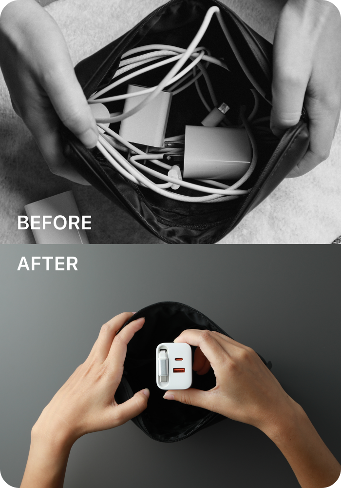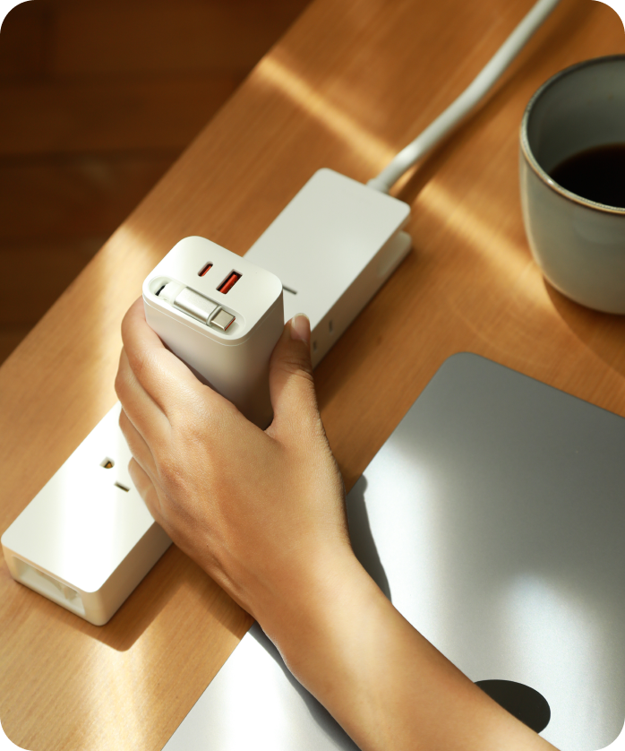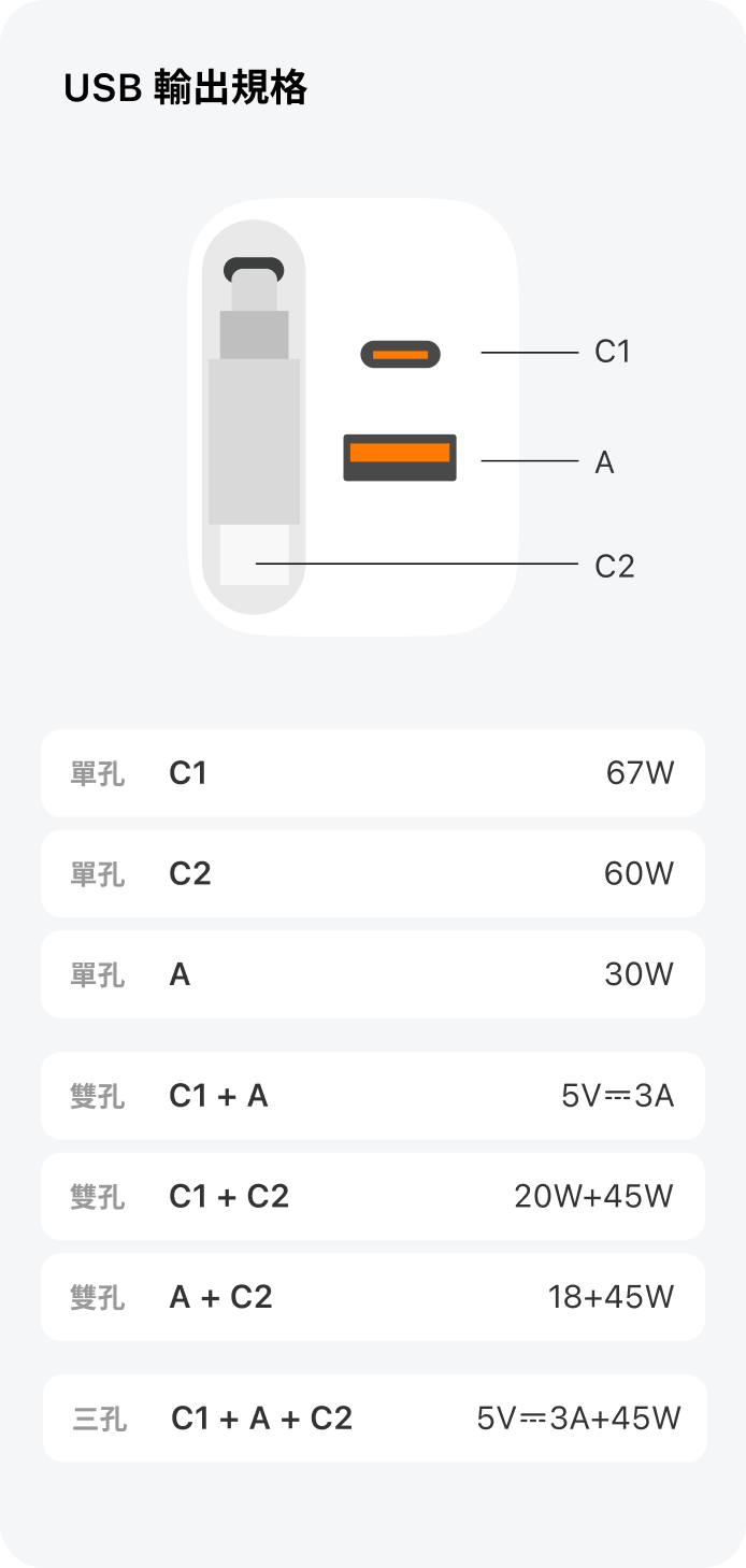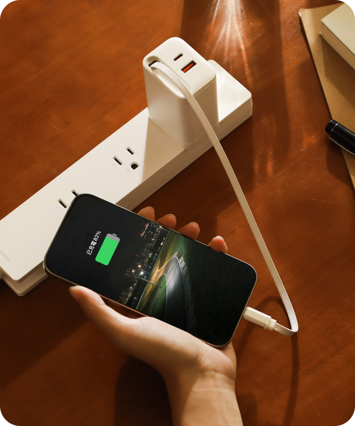 ● 1A1C 雙孔設計:除內建 USB-C 線外,還可外接其他充電線,同時為多個裝置充電。