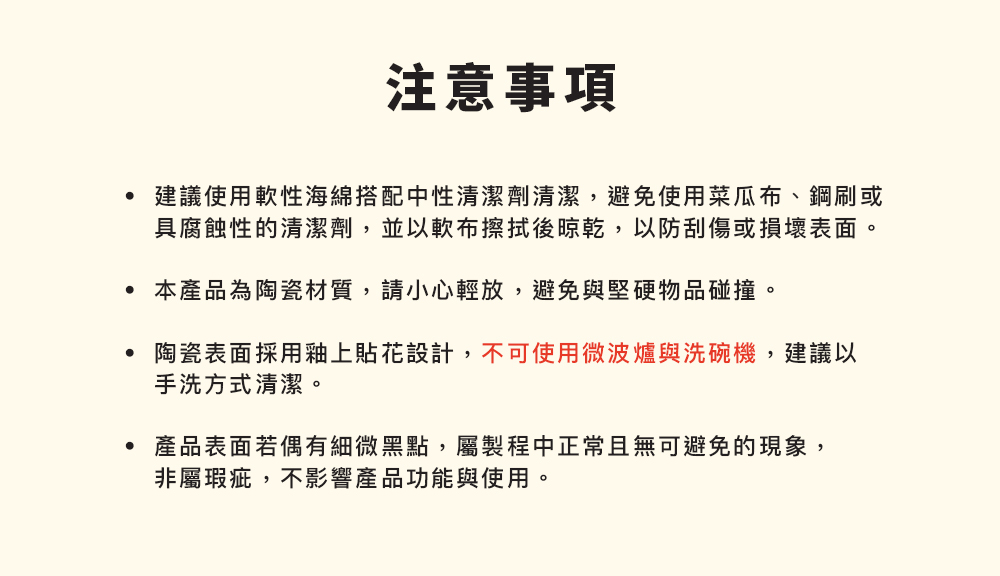 · 本產品為陶瓷材質,請小心輕放,避免與堅硬物品碰撞。