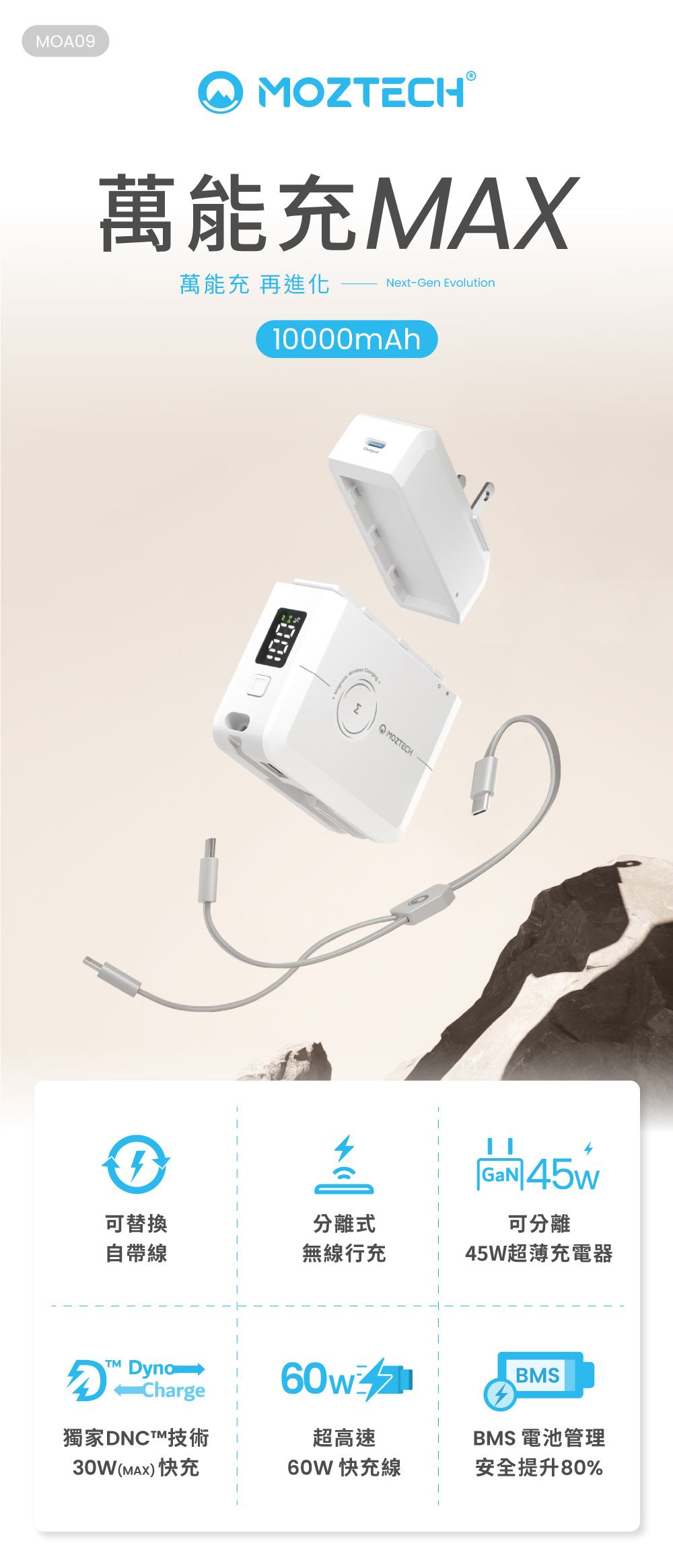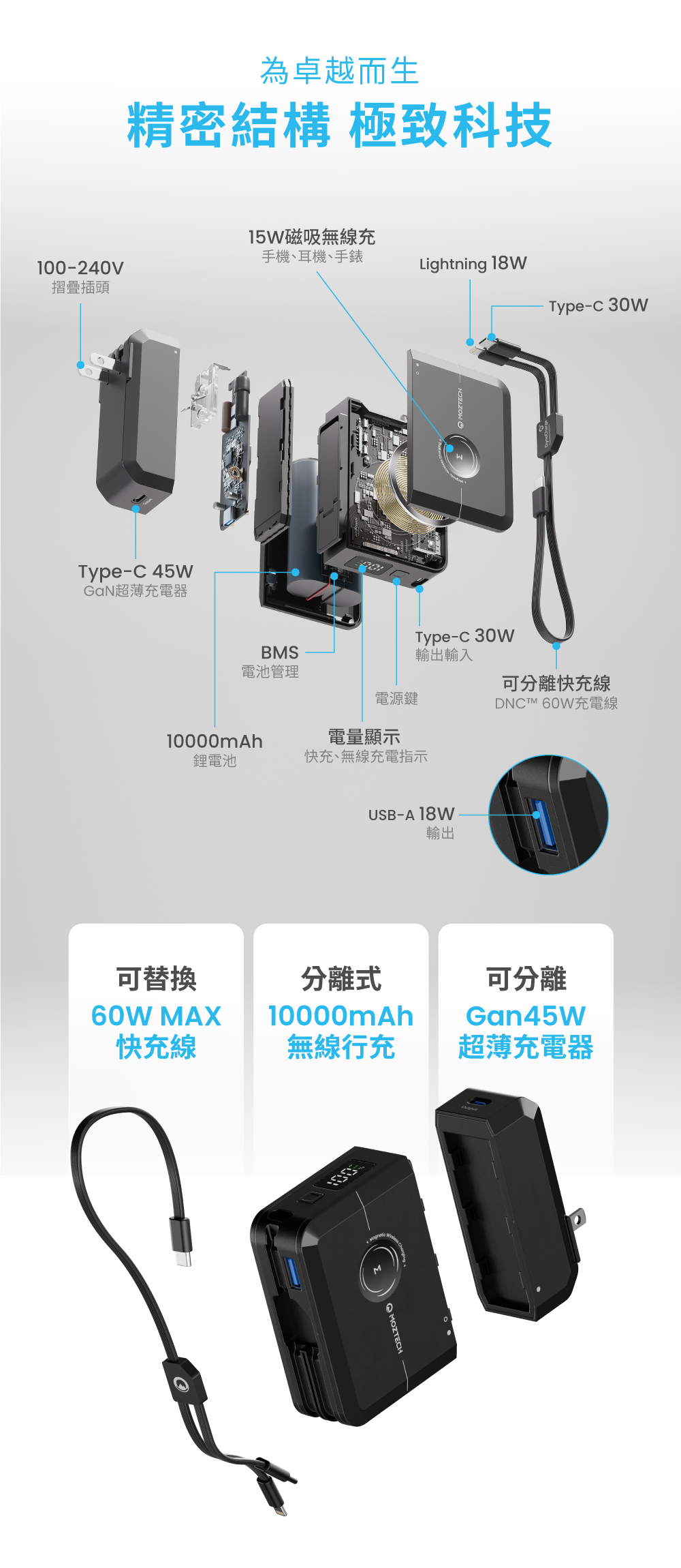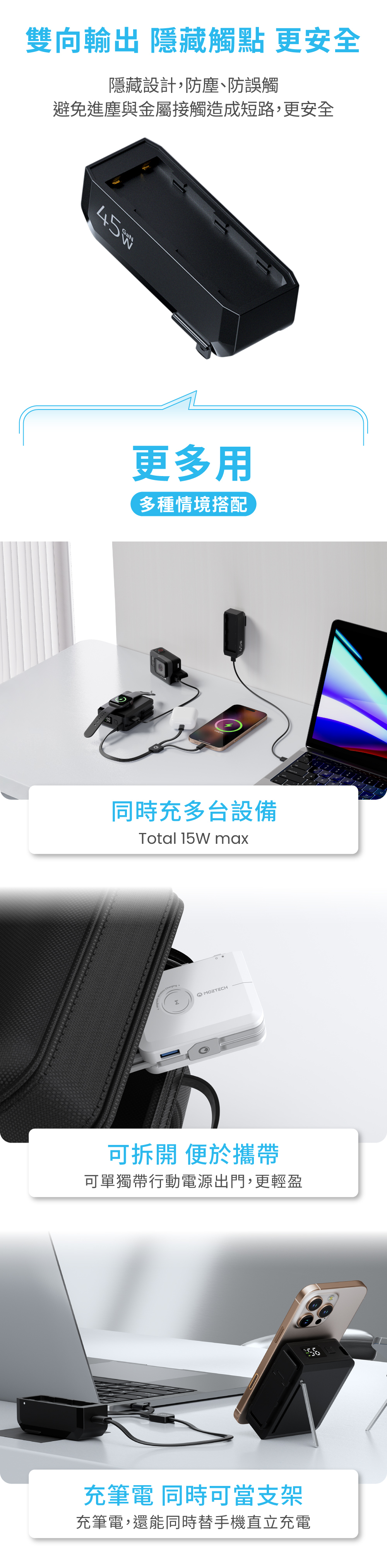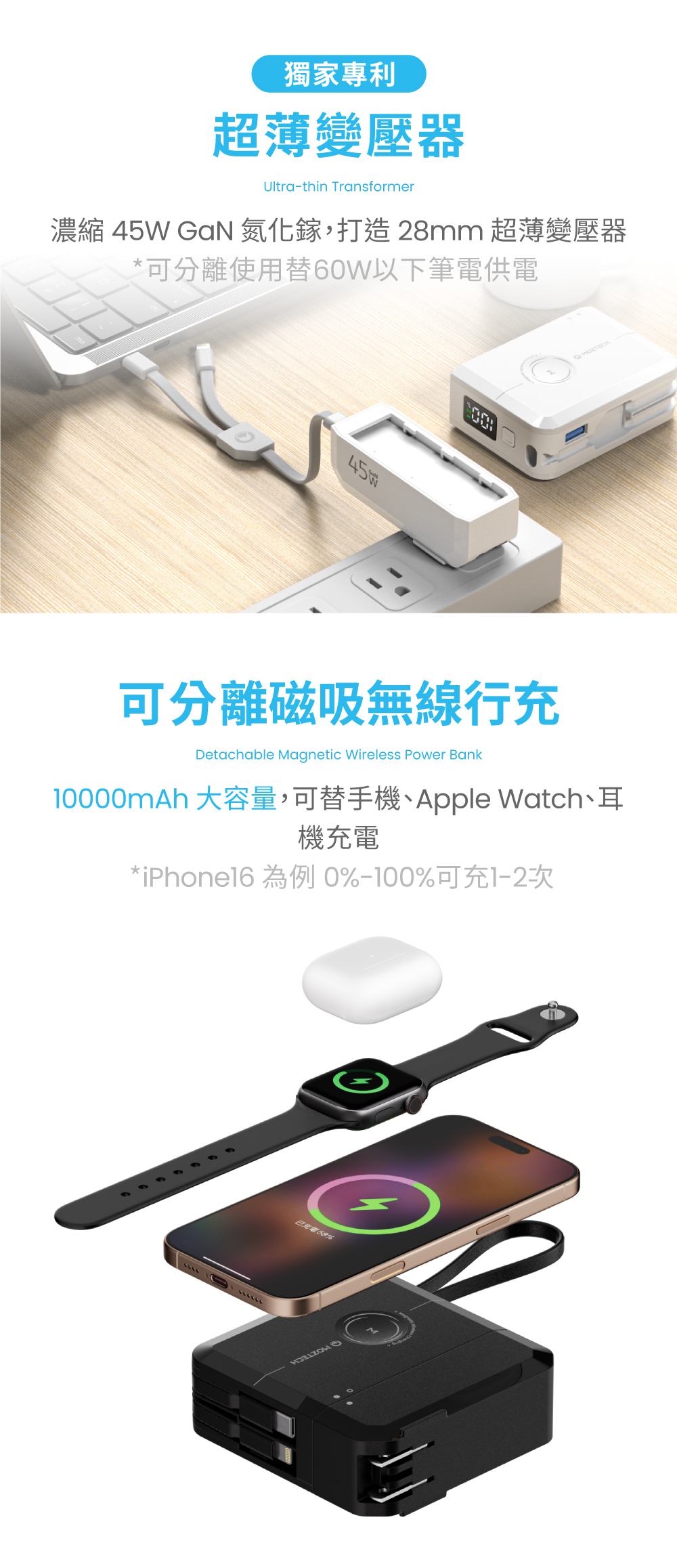 • 獨家專利,可分離超薄45W氮化鎵變壓器,支援65W以下筆電充電
