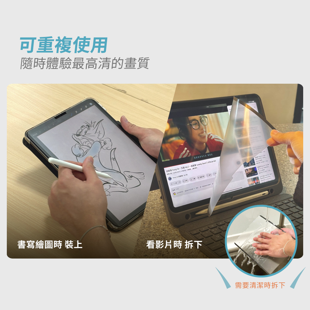 • 繪圖/追劇自由切換,書寫繪畫時裝上 提升書寫手感 / 觀賞娛樂時直接拆下 體驗iPad原本高清的畫面