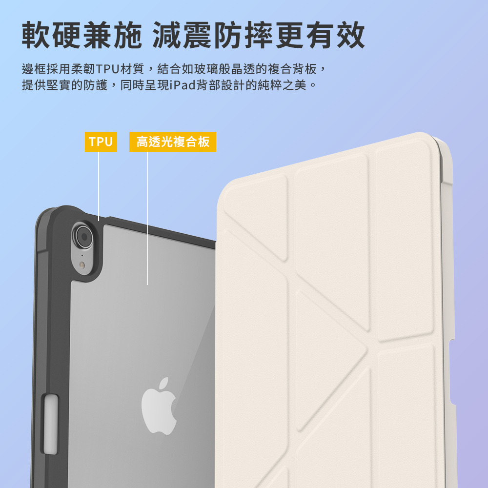 ● 防摔結構邊框與透明背板,有效防止iPad彎折與刮傷。