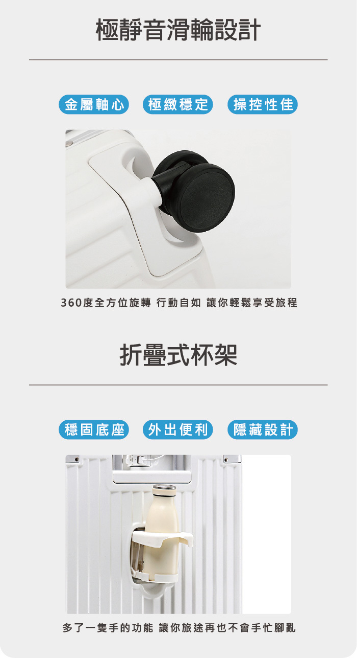 ▸ 極靜音滑輪設計:360度全方位旋轉,讓您輕鬆享受旅程。