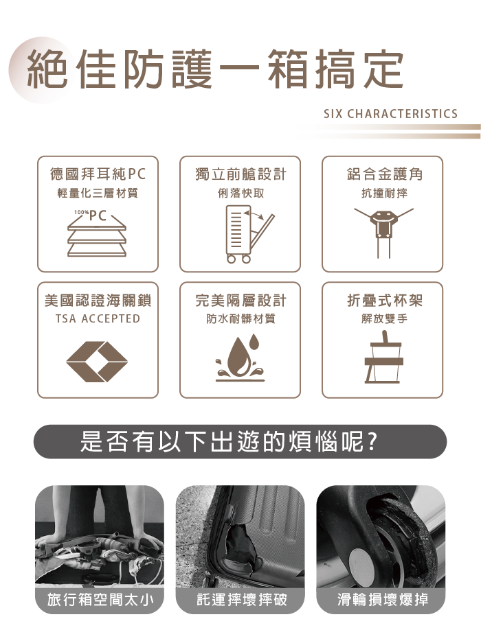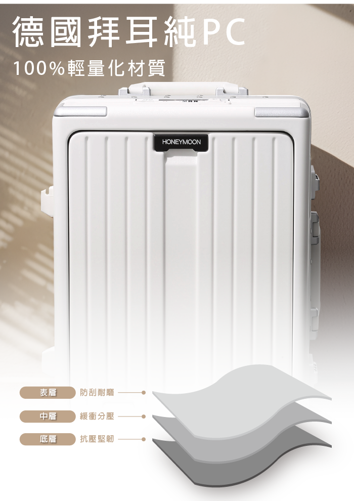 ▸採用PC + ABS 頂規材質:讓您出國不擔心破箱問題。