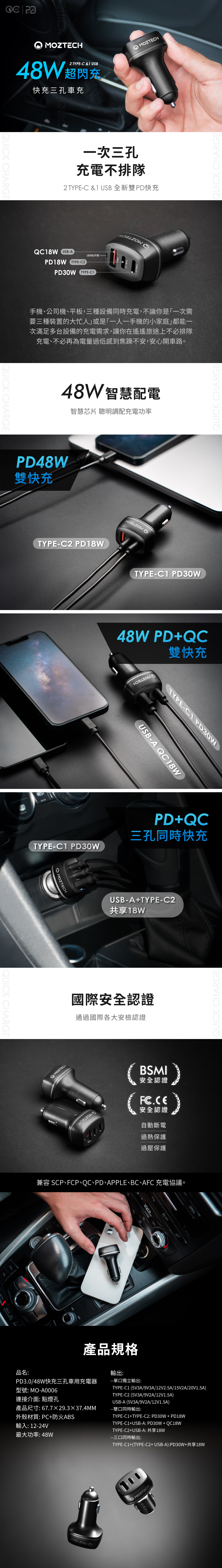MOZTECH | PD3.0/48W快充三孔車用充電器