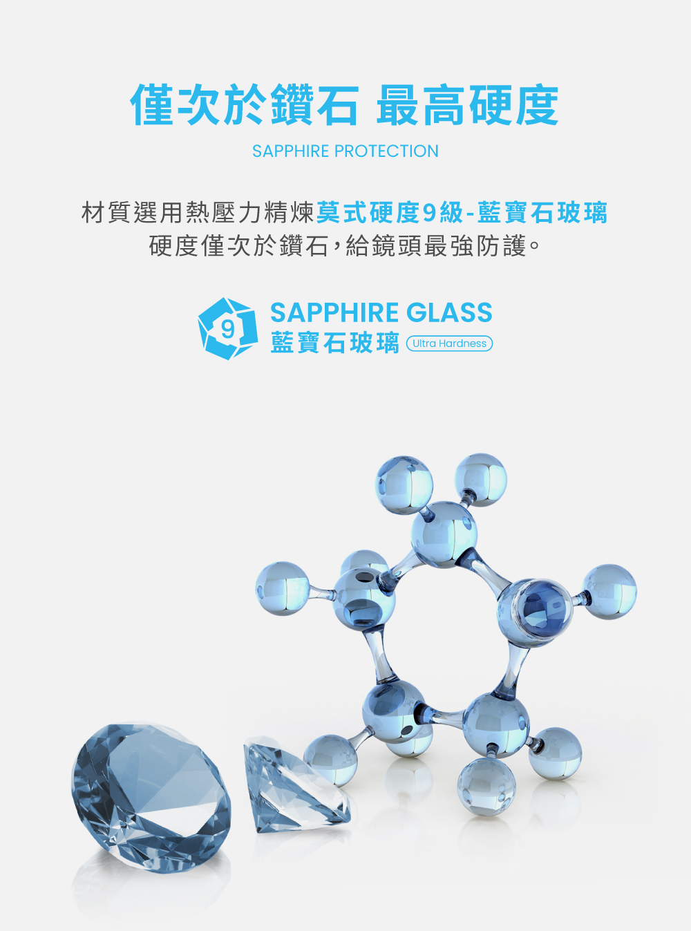 - 材質選用熱壓力精煉莫式硬度9級-藍寶石玻璃,硬度僅次於鑽石,給鏡頭最強防護