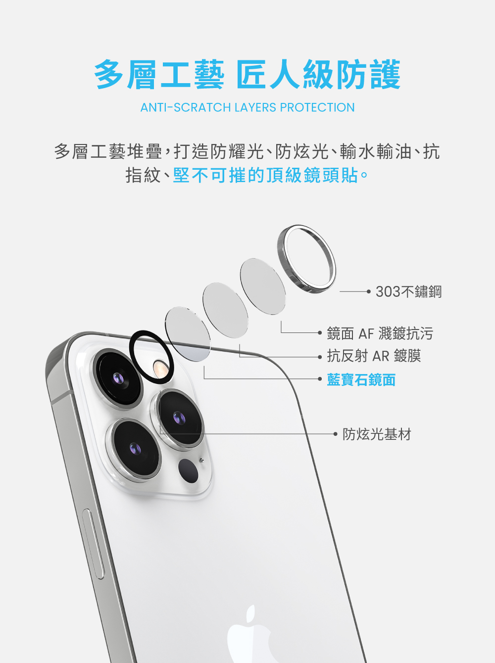 - 多層工藝堆疊,打造防耀光、防炫光、疏水疏油、抗指紋、堅不可摧的頂級鏡頭貼