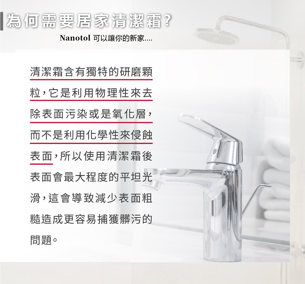 - 奈米清潔霜可以簡單有效去除表面污垢,殘膠、鏽斑