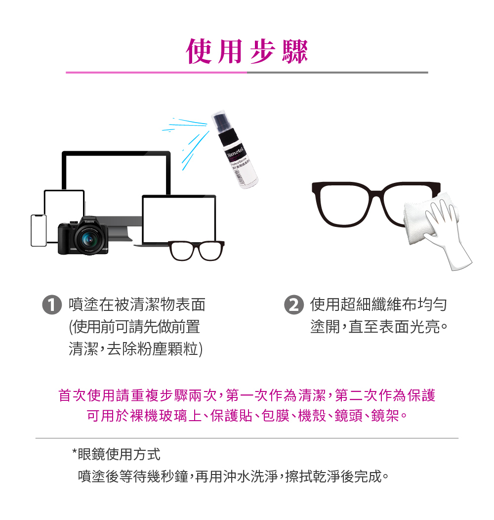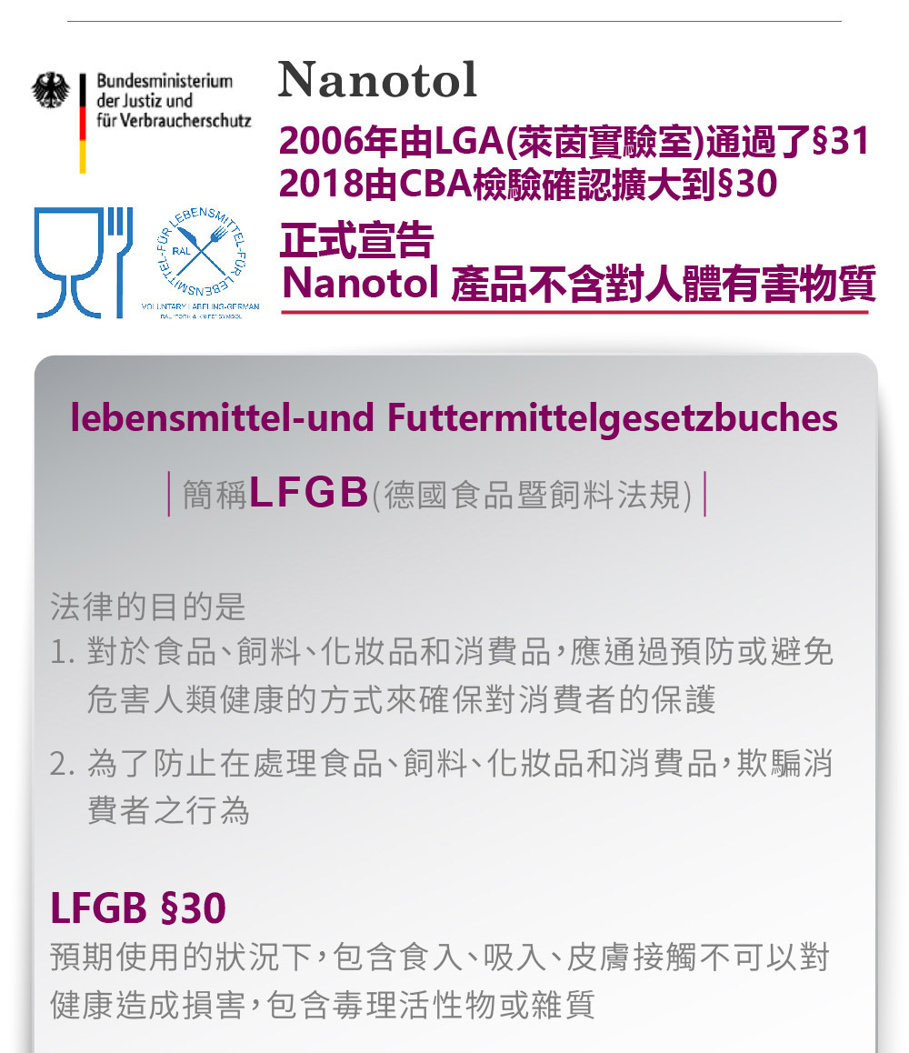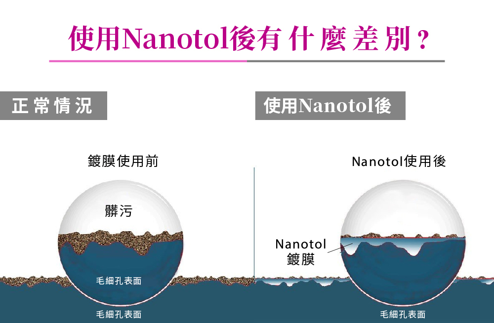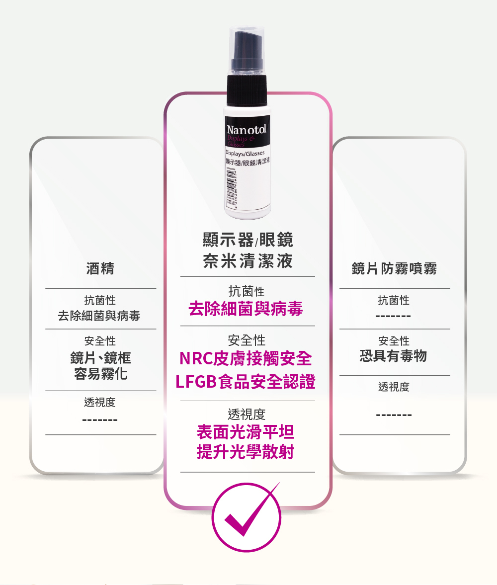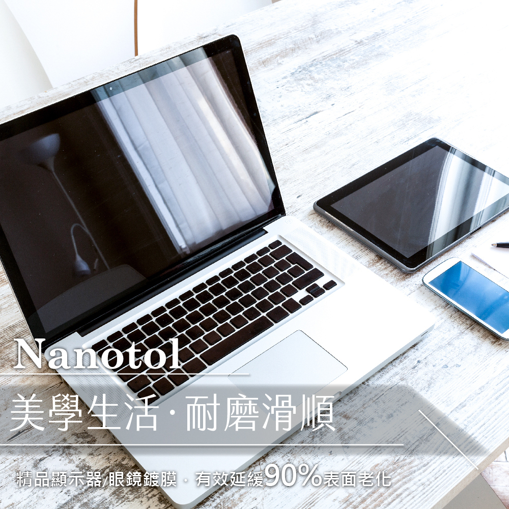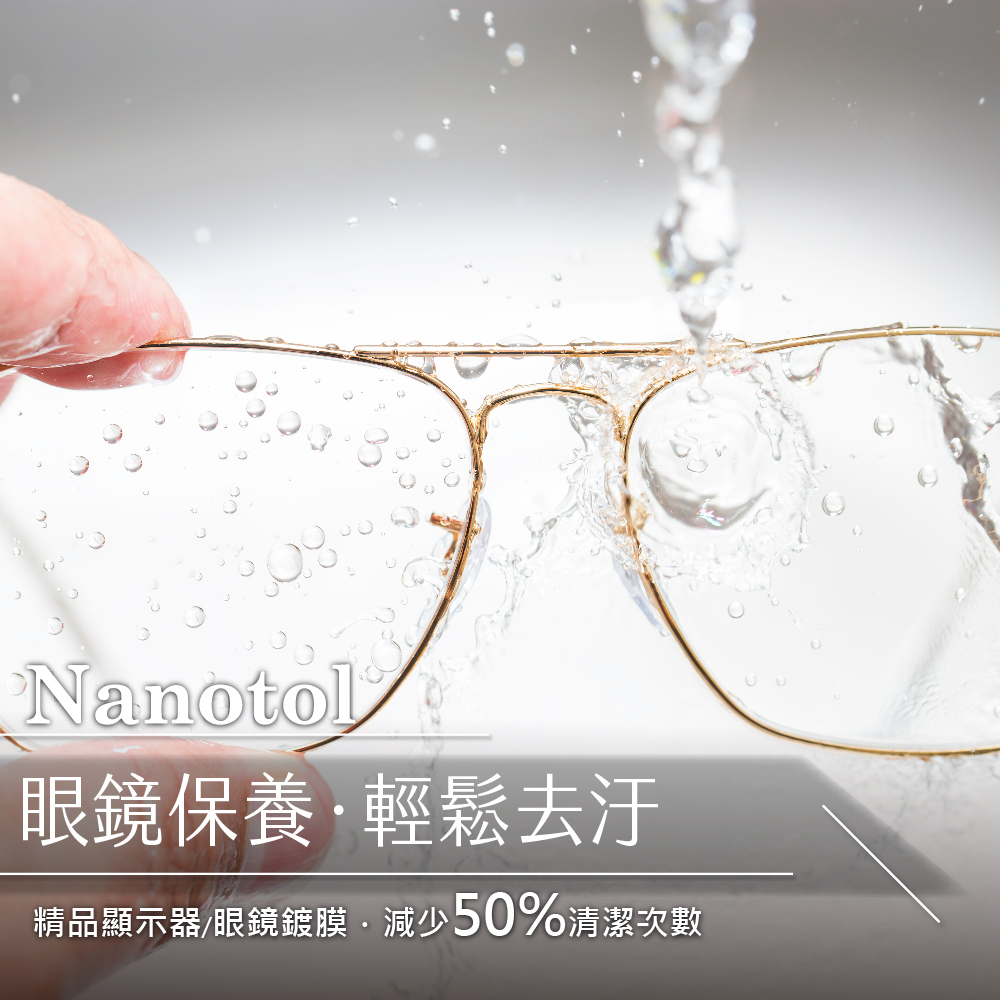 - Nanotol 不含任何酒精、有機溶劑,因此可用於所有敏感表面、光學等級鏡頭、3C產品、眼鏡框架而無需擔心