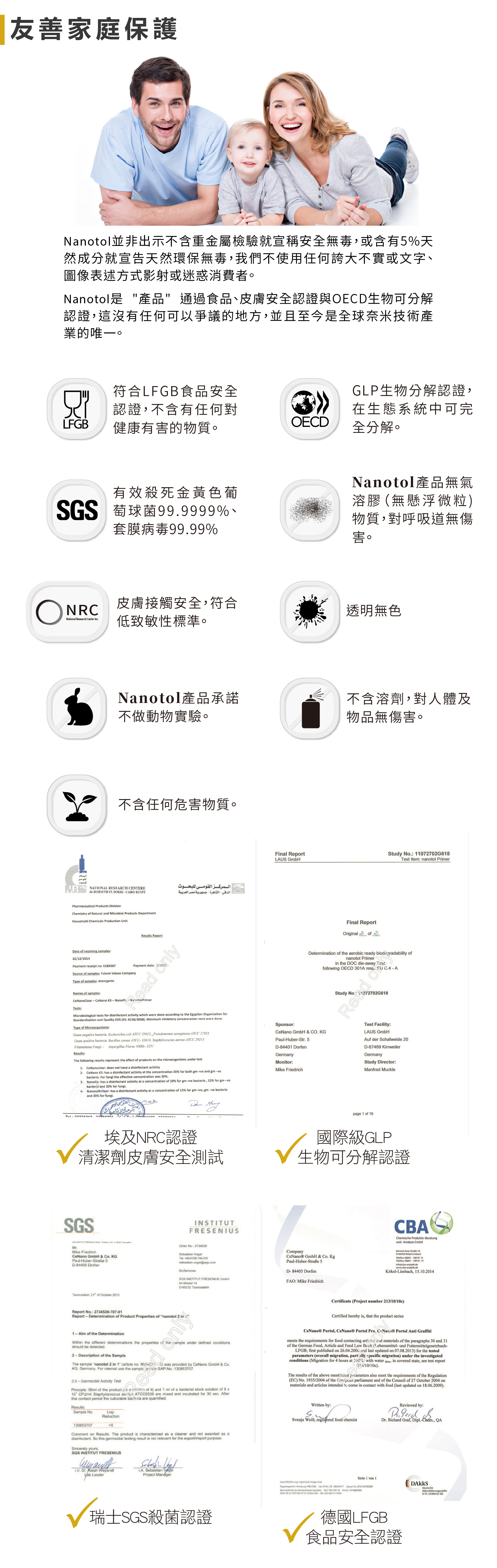 A:不會的,經國德國LUS(萊茵實驗室)證實,並由德國通過LFGB認證將Nanotol歸類為對人體無害物質