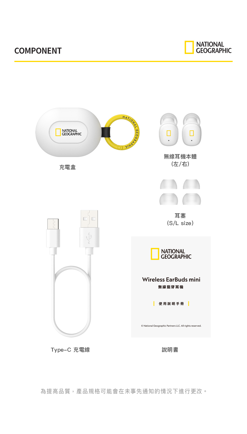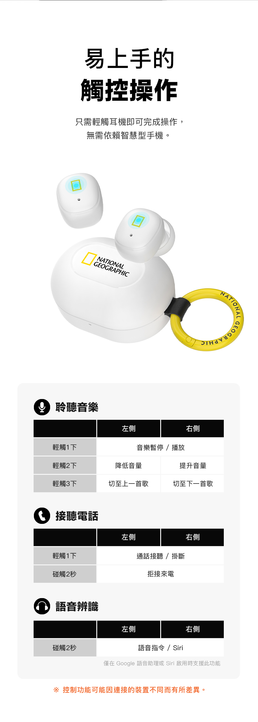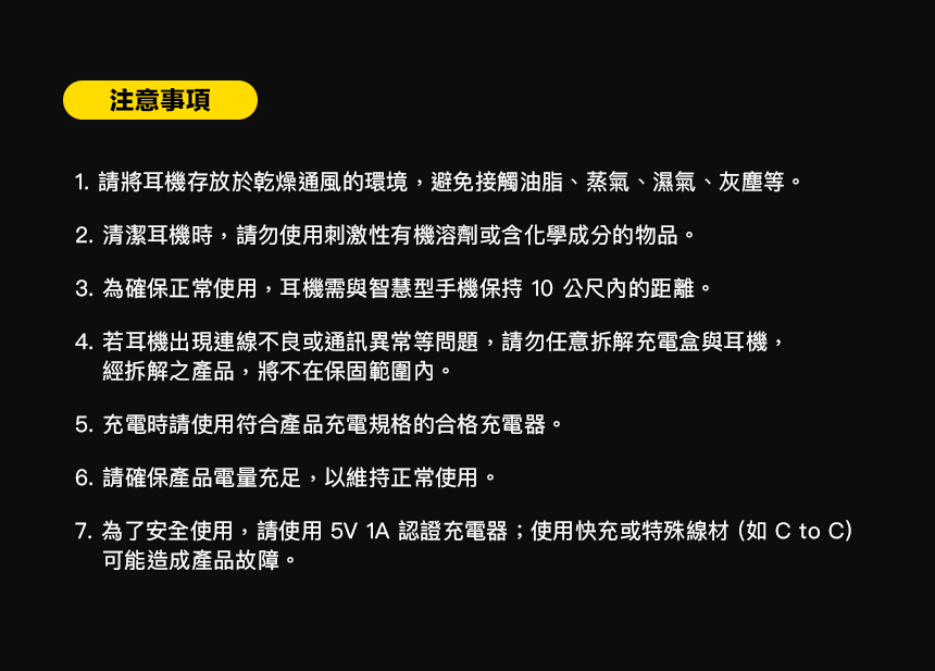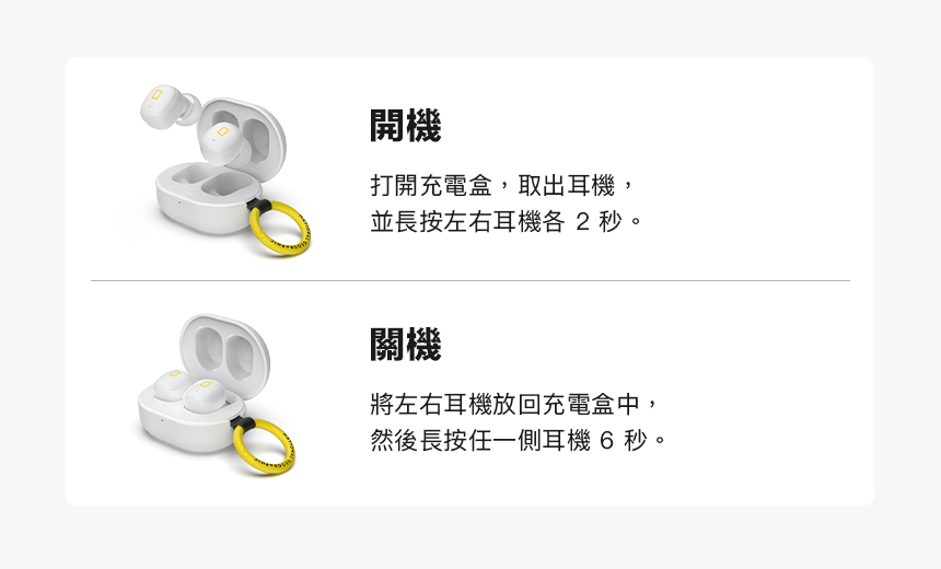 • 開機 : 打開充電盒,取出耳機,並長按左右耳機各2秒。