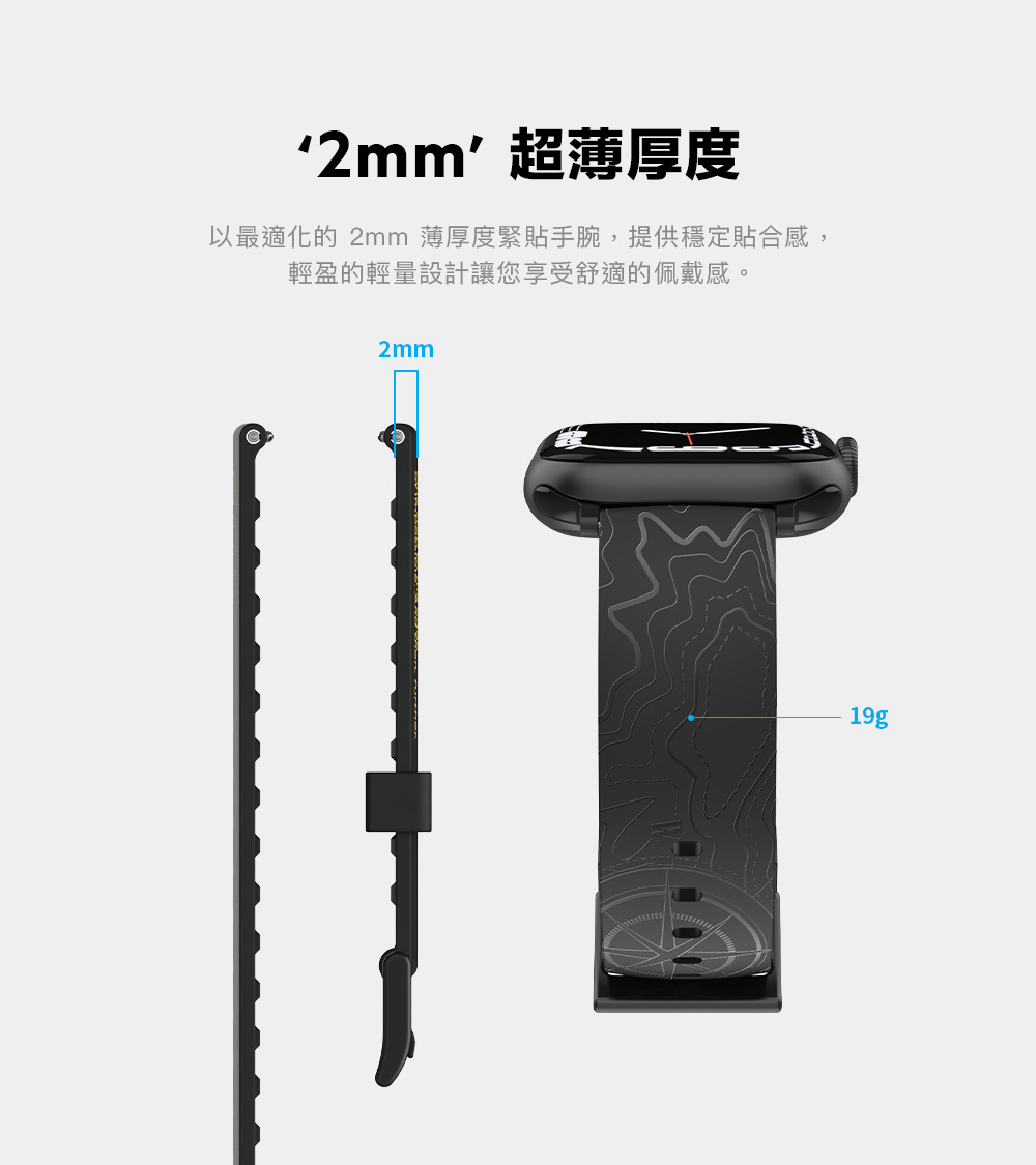 • 以最適化的2mm薄厚度緊貼手腕,提供穩定貼合感,輕盈的輕量設計讓您享受舒適的配戴感