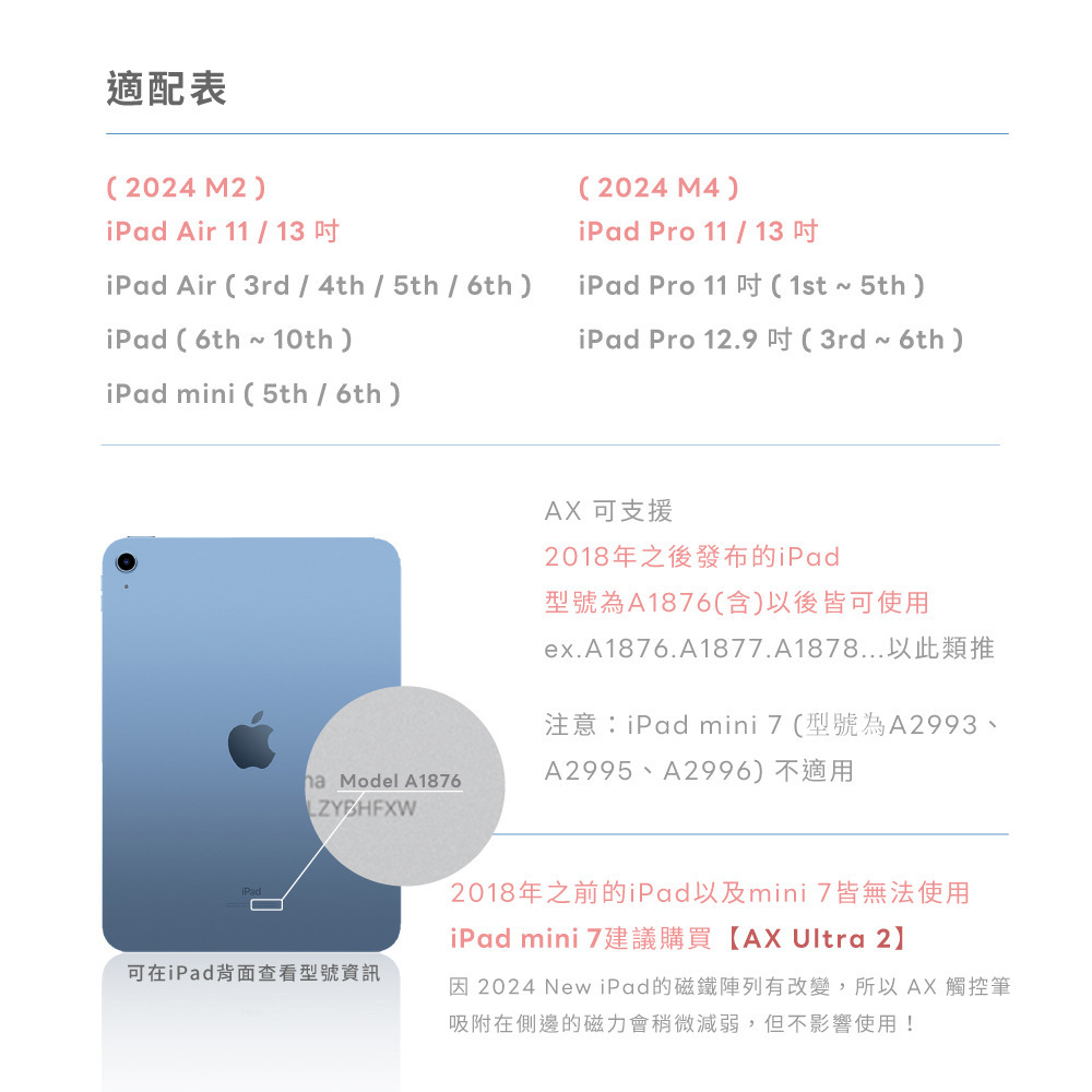 ※ 因2024 New iPad的磁鐵陣列有改變,所以AX 及AX Ultra 2觸控筆磁吸功能不適用2024新iPad,但不影響書寫使用!