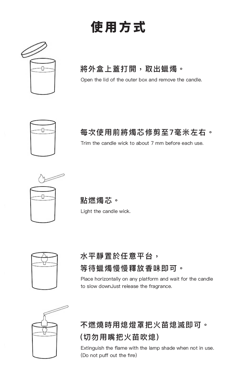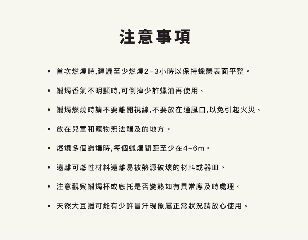 1. 本公司不對因消費者未遵守產品標籤上或網站提供的任何安全警示、不當使用、或人為疏忽所導致的任何意外、損害或損失負責。點燃蠟燭涉及火源風險,請務必遵照指示安全使用。
