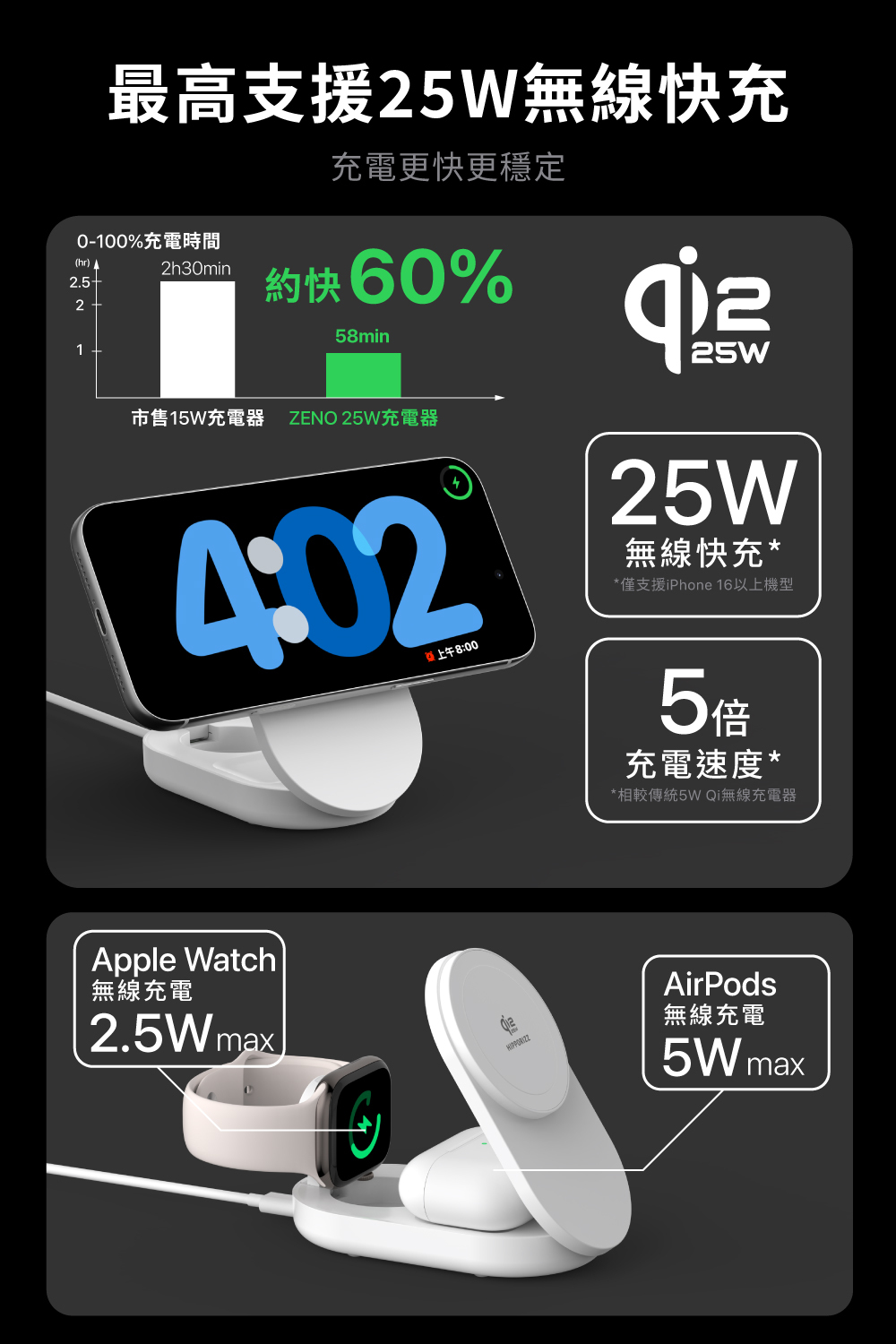 ▪ 最高支援 25W 無線快充:相較 15W 無線充電,充電效率提升 135%