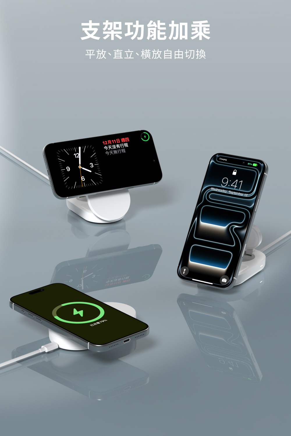 ▪ Apple、Android 皆適用:無磁吸機型也能平放使用