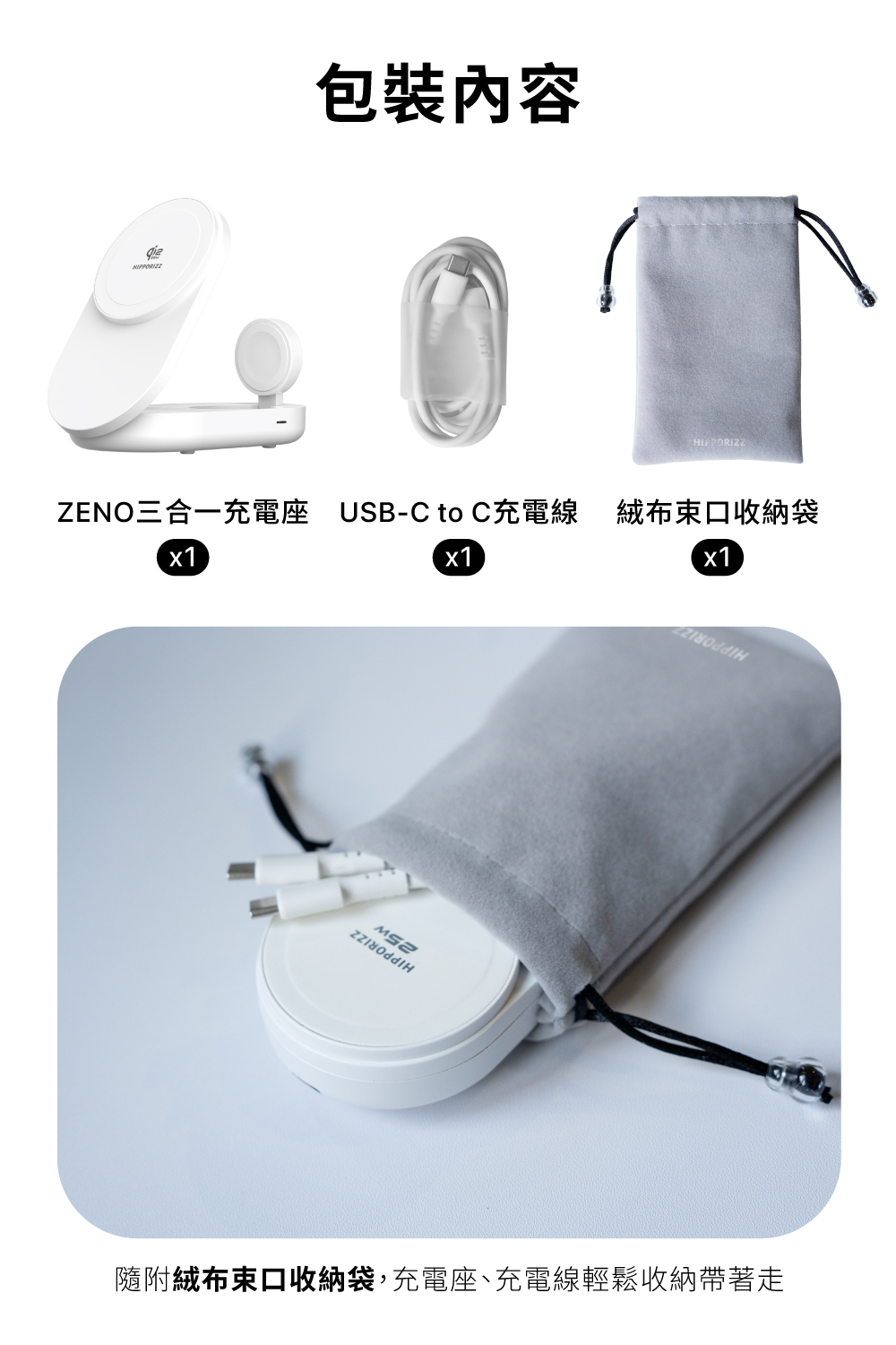 • 包裝內容物:ZENO三合一充電座*1, USB-C to C充電線*1, 絨布束口收納袋*1